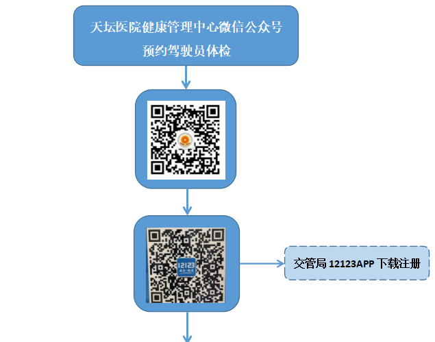 1.微信搜索“北京天坛医院健康管理中心”微信公众号或手机扫描二维码预约驾驶员体检。