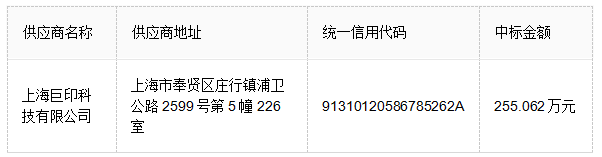 中标成交供应商名称:上海巨印科技有限公司