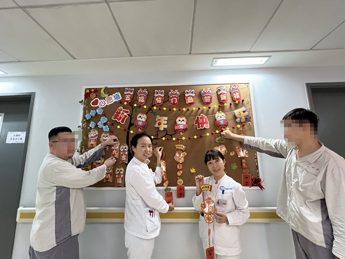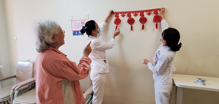 北京天坛医院运动障碍疾病科和头痛科的病房里热气腾腾,欢声笑语,医护人员与住院患者共同手工制作龙年拉花,精心装点病房,感受浓浓的年味,温暖祥和的医患情,欢乐喜庆的祝福意洋溢在每个角落。不能回家的病友纷纷感叹道:“原以为在医院过年会冷冷清清,没想到医护人员早就想到了和我们一起过年,氛围感满满!”