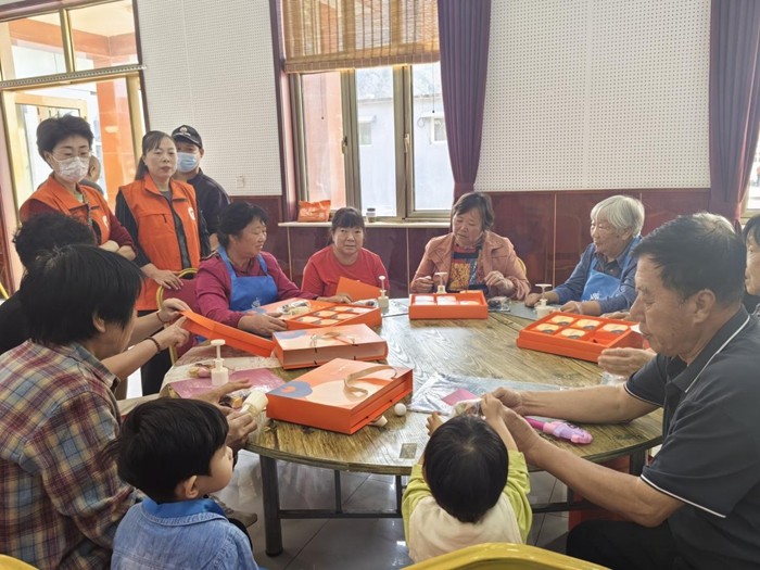 讲座结束后,房山区第一书记为民先锋队的成员们和村民们围坐在一起,热热闹闹地开展包月饼活动。大家分工合作、互相配合,有人擀皮、有人包馅、有人压模,现场不时传来欢声笑语。一个个香甜可口、形态各异的月饼很快在大家的巧手中诞生,浓浓的节日氛围溢满整个活动室。第一书记们在活动中不仅展现了自己的“巧手”技艺,更在与村民的交流中拉近了彼此的距离。大家一边包月饼,一边聊家常、谈发展,现场气氛温馨融洽,真正让村民感受到了“第一书记就在身边、为民服务暖心田”。