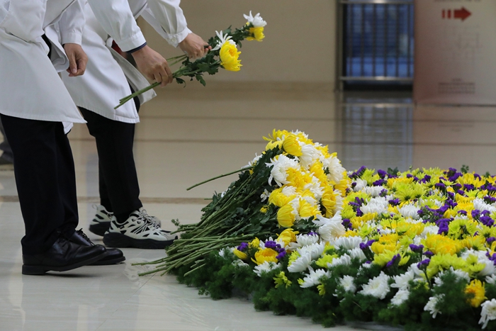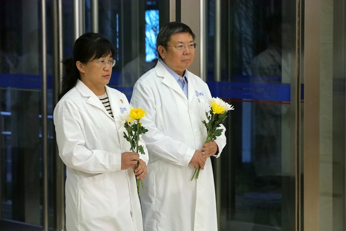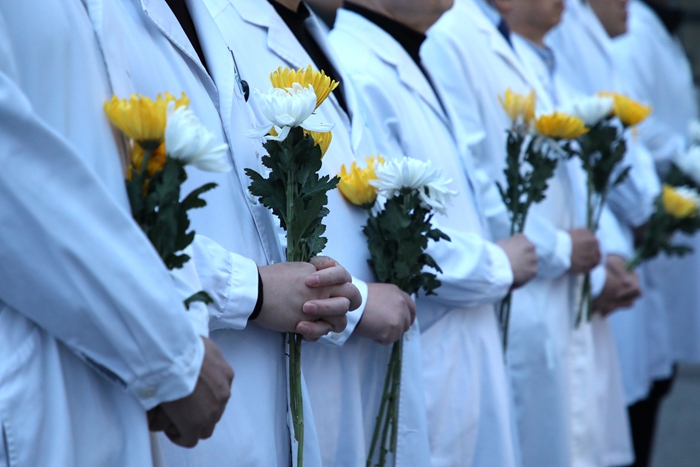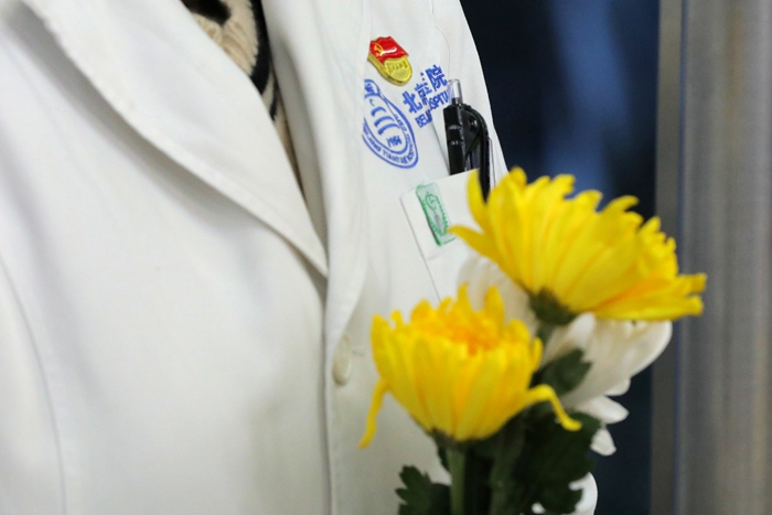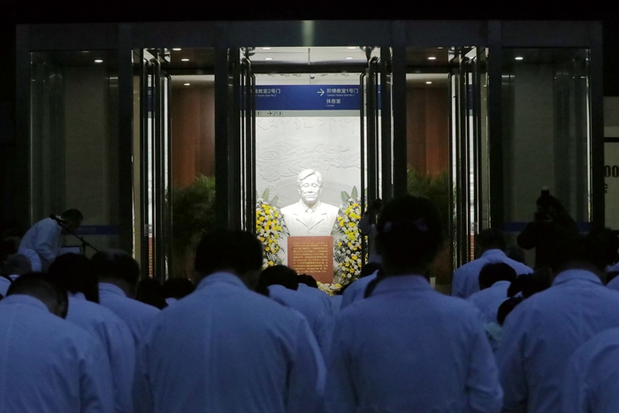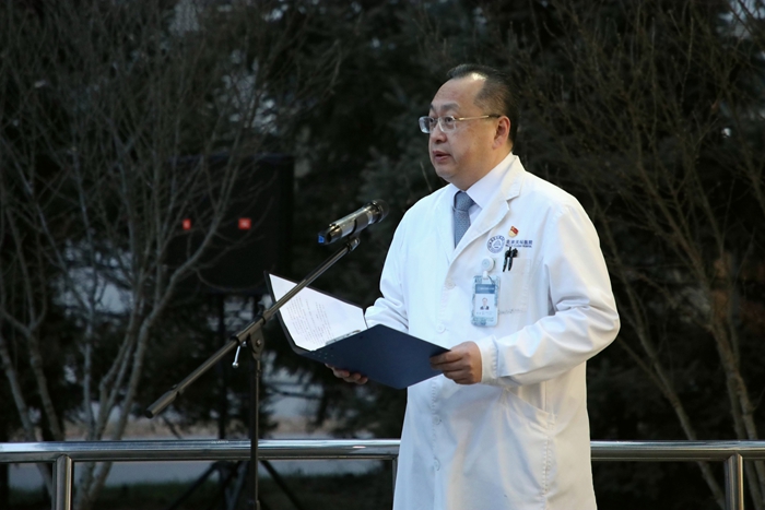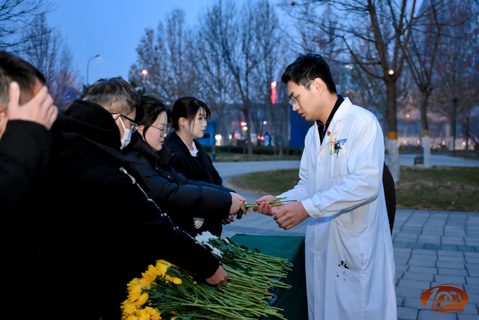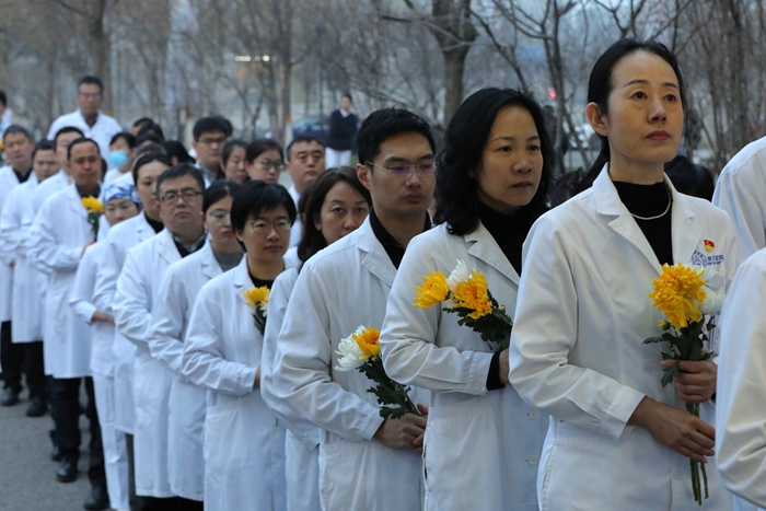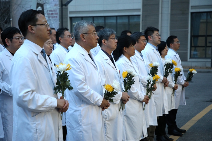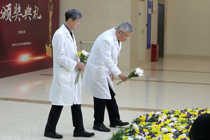 7时30分,来自北京天坛医院和北京市神经外科研究所的100余名医务人员代表,在医院领导班子的带领下,来到以王忠诚院士名字命名的“忠诚楼”,举行简朴而庄重的献花仪式。仪式由北京天坛医院党委副书记贾旺主持,全体参加人员身着白衣,整齐肃立,迎着朝阳向王忠诚院士塑像深深鞠躬,并献上代表追思和怀念的鲜花,以表达对这位医学巨匠的无尽怀念和崇高敬意。