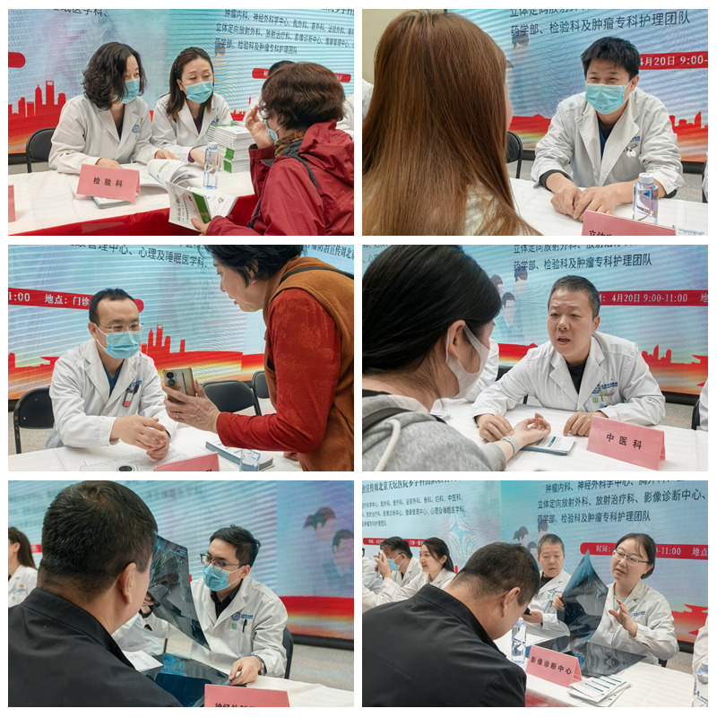 4月20日上午,肿瘤内科牵头,联合神经外科学中心、胸外科、普外科、泌尿外科、骨科、妇科、中医科、立体定向放射外科、放射治疗科、影像诊断中心、心理及睡眠医学科、药学部、检验科、肿瘤专科护理团队等科室在北京天坛医院门诊一部一层大厅举办了大型防癌抗癌多学科联合义诊活动。义诊现场气氛热烈,吸引了约300余名患者参与,期间共发放宣传手册200余份。各学科专家围绕肿瘤预防、早筛早诊、规范治疗及复发转移管理等问题,耐心细致地进行一对一解答,并提供个体化诊疗建议。